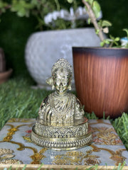 With intricate detailing—from serene facial features and adorned jewelry to the expressive bindi and delicate forehead ornaments—this sculpture radiates calm, compassion, and strength. Its medium-sized, polished golden brass form makes it equally perfect for home altar, puja room, meditation space, or gifting for weddings, festivals, and housewarmings.