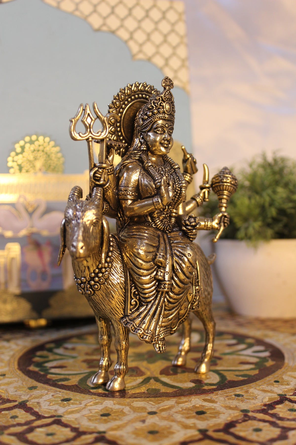 This statue embodies her strength, courage, and shielding spirit, with detailed ornamentation, radiant crown, multiple arms holding trident (Trishul) and weapons, and expressive facial features. The sturdy brass adds longevity, and the goat symbolizes resilience and dynamic power against adversity.