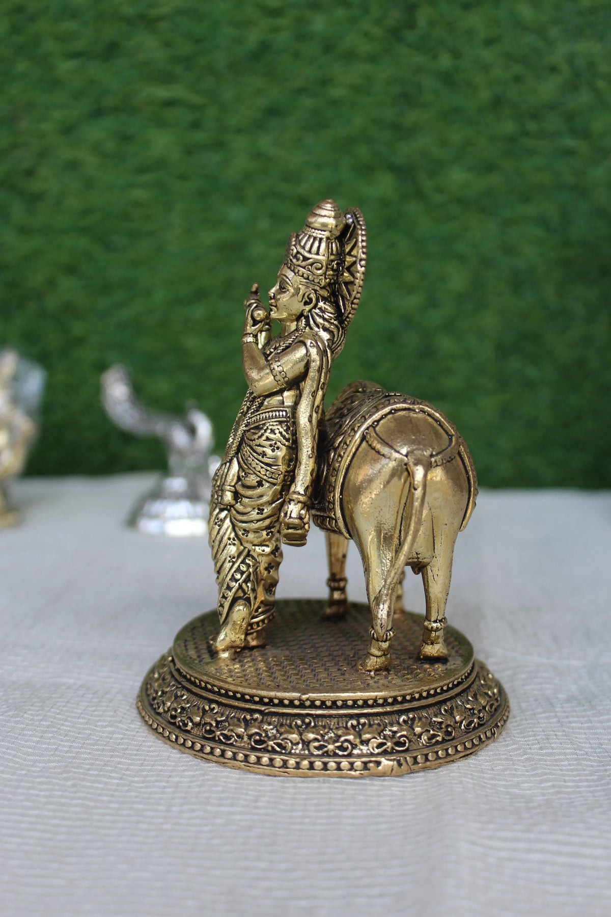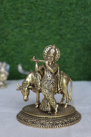 Brass Krishna With Cow Idol | Divine Sculpture Of Lord Krishna & Sacred Cow (5.00 inch)