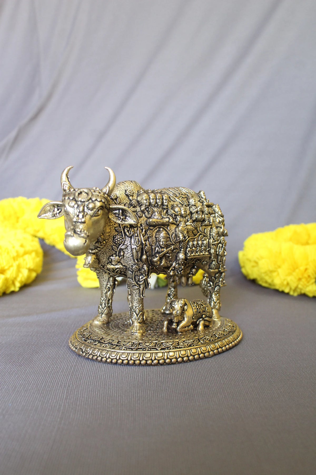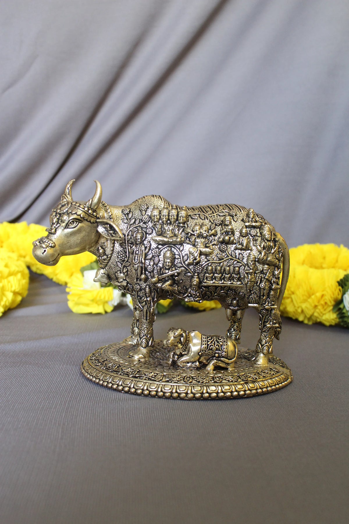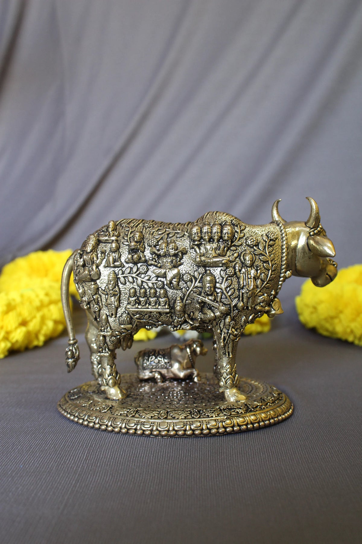 Bring home this divine Brass Kamdhenu Cow and Calf Idol engraved with gods and fill your space with her eternal blessings of wealth, protection, and spiritual abundance for you and your family.