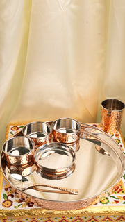 Experience authentic Indian dining with the Royal Copper Thali Set - 7 PC, impeccably crafted to blend tradition, luxury, and durability. This elegant dinner set features a high-quality, food-grade pure copper build, reflecting the timeless beauty and opulence of Indian tableware. The set includes all essentials: 1 thali plate, 3 bowls, 1 pudding plate, 1 glass and 1 spoon , making it ideal for family meals, festive occasions, or gifting. The copper’s natural properties not only enhance the nutritional value of your meal but also lend a royal, vintage touch to your dining experience. Every piece is designed to add sophistication to your table, combining exquisite craftsmanship with the promise of durability and ease of use. Embrace a royal tradition and elevate daily meals with this beautiful, versatile thali set